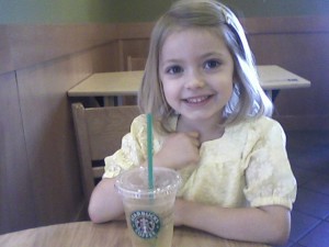 We were up early on Saturday morning, anticipating Jason’s return home in the afternoon. And, after straightening up the aftermath of the previous day’s playdate, Hannah asked if we could go to Target “to look at clocks.” We are very slowly working towards redecorating Hannah’s room, and turning it from a “baby” room, to a “big girl” room…new bed (soon – I hope!), new comforter (already purchased), and paint (already picked out – “Petal Pink”). And, Hannah wants a clock…an alarm clock…a Tinkerbell alarm clock, to be specific. So, we did just that. We didn’t find exactly what she was hoping for, but we’ll keep looking.  I did find some great deals over in the school supplies aisle though! :) (Yay for school supplies!!) After our shopping, we stopped at Starbucks for a little treat…